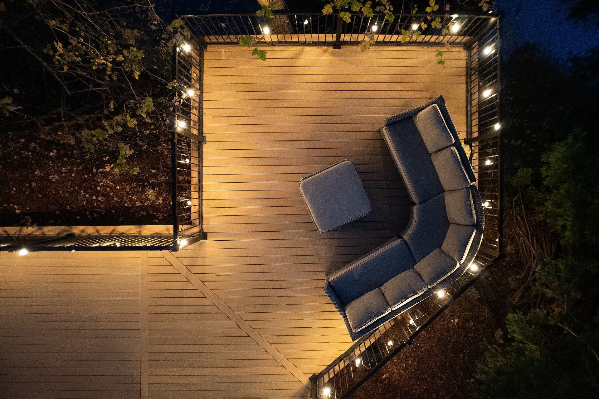 We built the deck using TimberTech’s Advanced PVC Vintage Collection, a material with a Class A Flame Spread Rating. The framing was done with TimberTech’s aluminum structure for enhanced durability. We added aluminum railing with a custom drink rail in matching color and installed integrated step lighting for safety and ambiance.