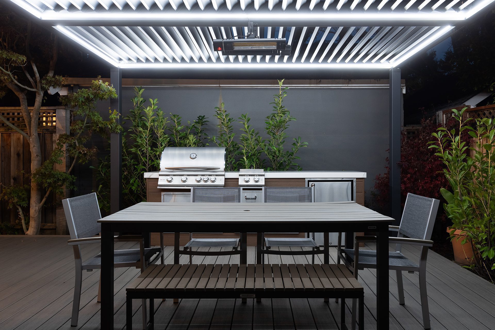 We built a single-level deck for better flow and comfort. The old structure was replaced with a StruXure smart pergola, allowing adjustable coverage based on the weather. We also installed custom lighting and a personalized shed, now serving as Chris’s dedicated home office.
